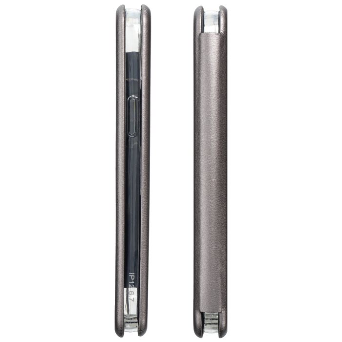 Der Umschlag des grauen Elegance Book Case hat eine leicht schillernde Oberfläche, ist etwas verstärkt und hat in der Lautsprecheröffnung ein Gitter.