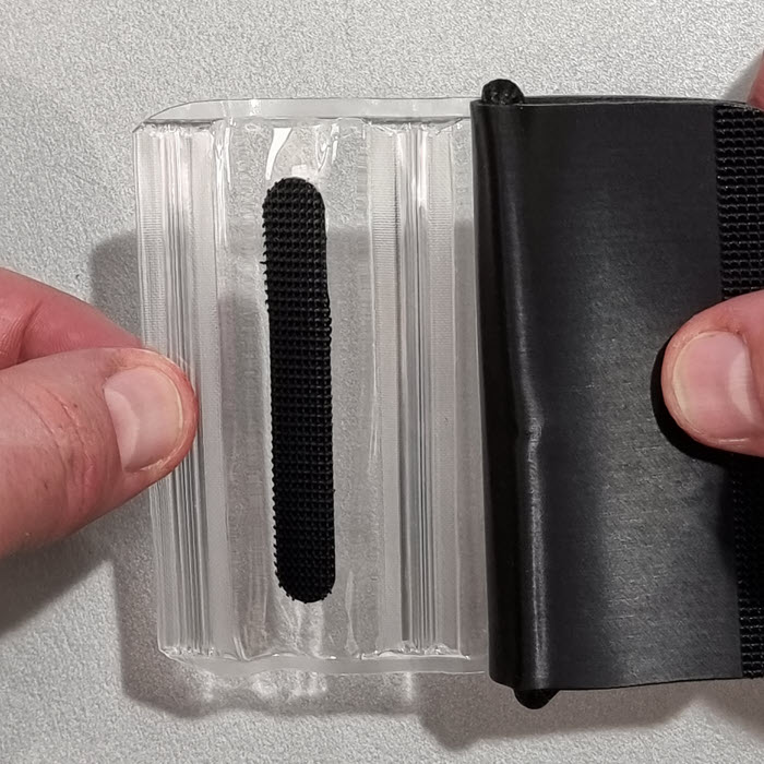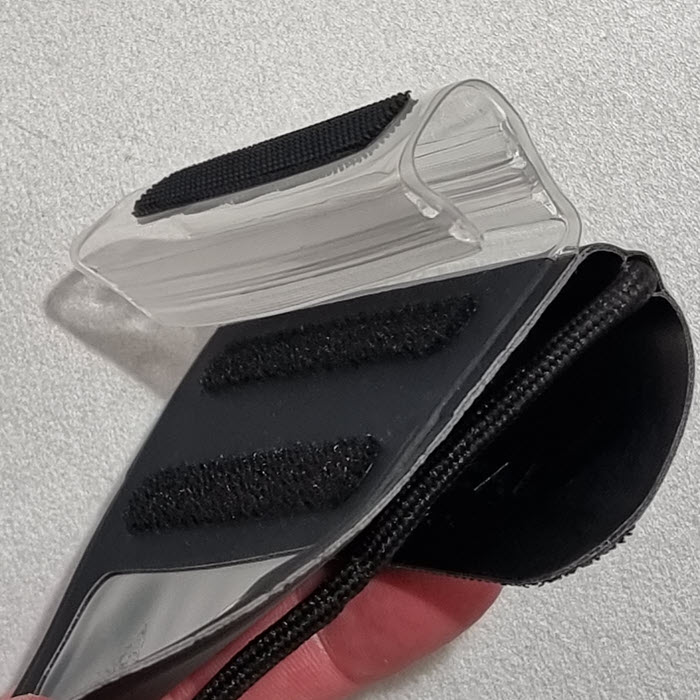 Die äußere Lasche wird darüber geklappt und auch mit einem Klettverschluss befestigt.