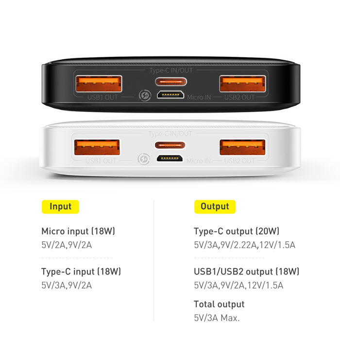 - Output Type-C: 5V / 3A, 9V / 2.22A, 12V / 1.5A - PD